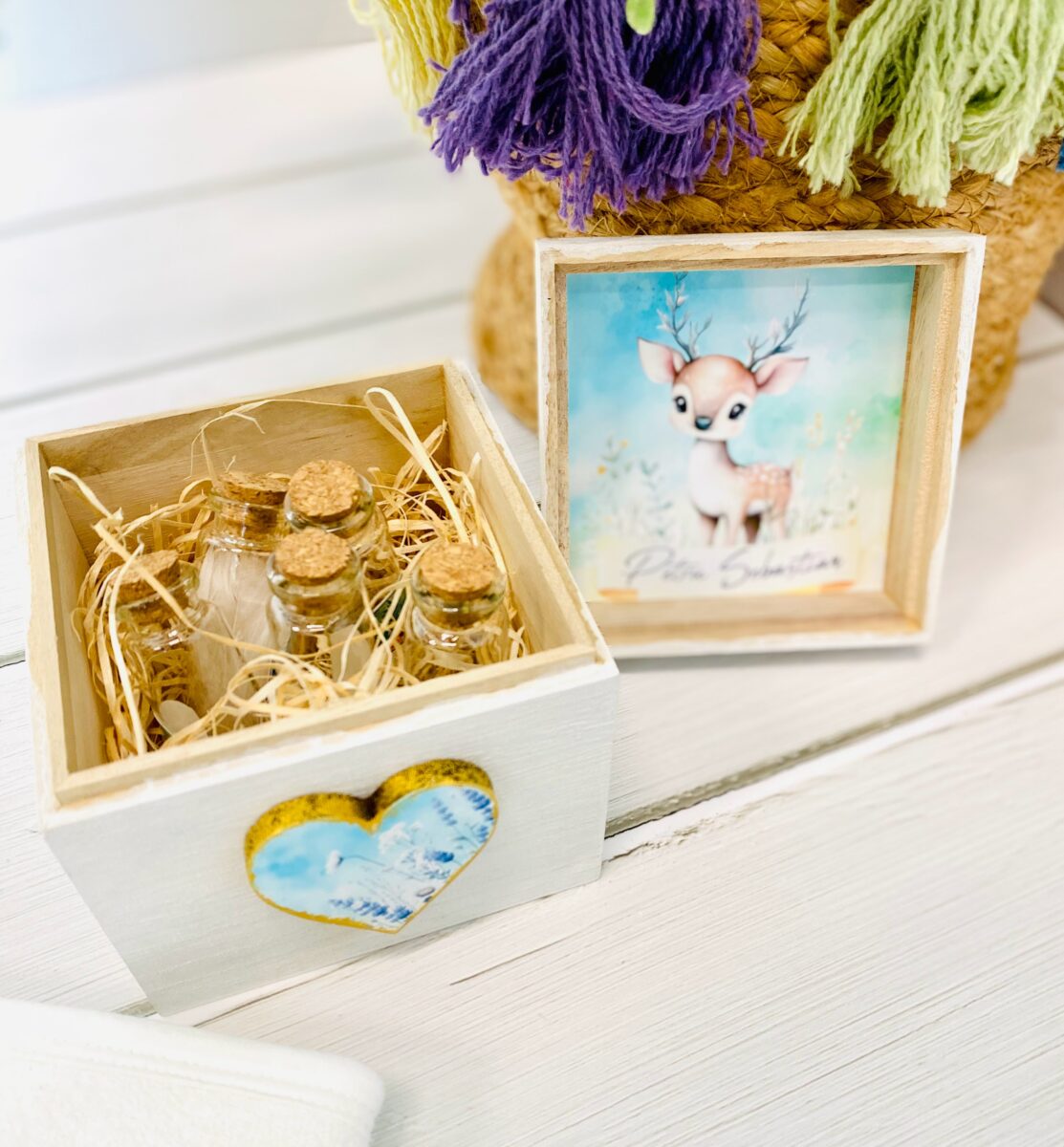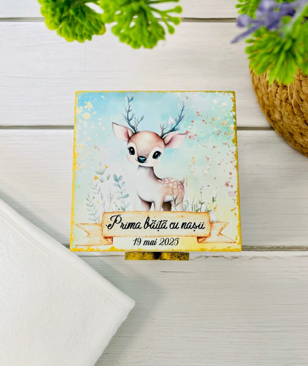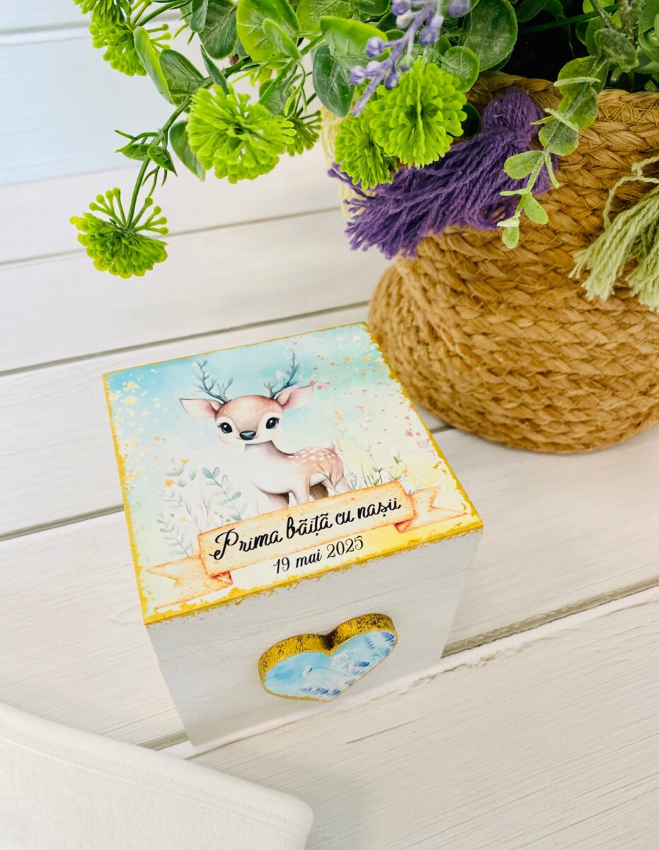 - Cutiuță de lemn personalizată, decorată cu grijă, care include 5 sau 10 elemente speciale pentru băiță (elemente naturale, esențiale pentru acest ritual tradițional).