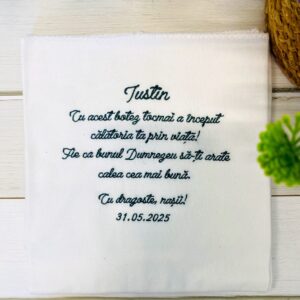 – Pânză de mir din finet brodată, personalizată cu numele și mesajul ales, dimensiune 90×90 cm.