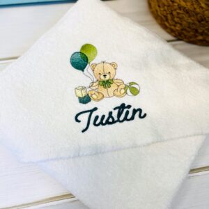 – Prosop cu glugă brodat, cu tematica dorită și numele copilului, dimensiune 80×80 cm.