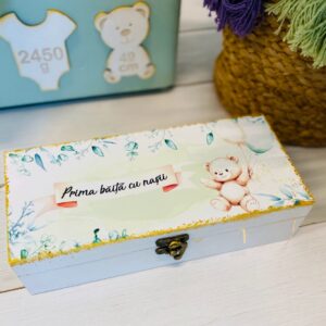 – Cutie de lemn personalizată, dimensiune generoasă de 40x30x16 cm, ideală pentru păstrarea amintirilor de-a lungul anilor.